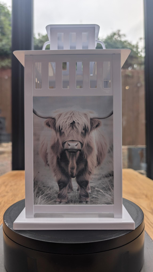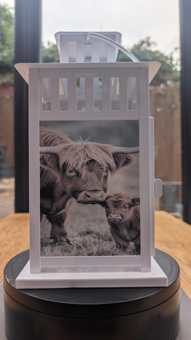 A new design of our amazing Highland Cow lantern. Each lantern has four different images on one lantern. We can do them in a white or black lantern